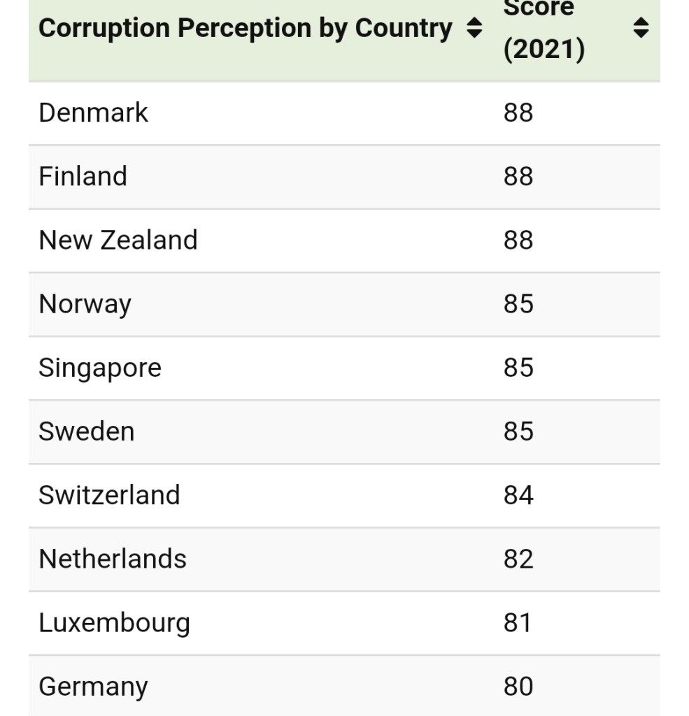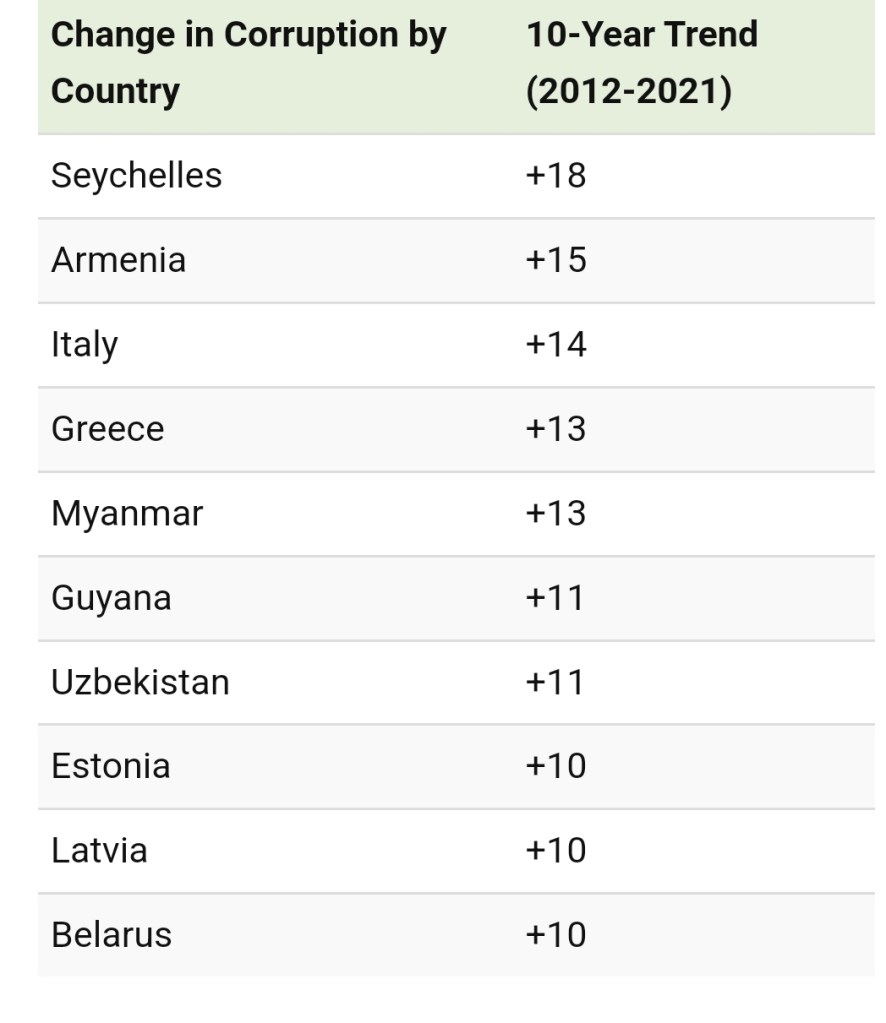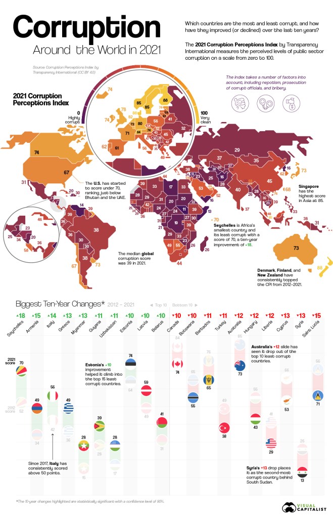 The biggest climber with +18 was Seychelles, Africa’s smallest country and also its least corrupt with a score of 70. Other notable improvements include neighboring countries Estonia, Latvia, and Belarus, with Estonia rising into the top 15 least corrupt countries.