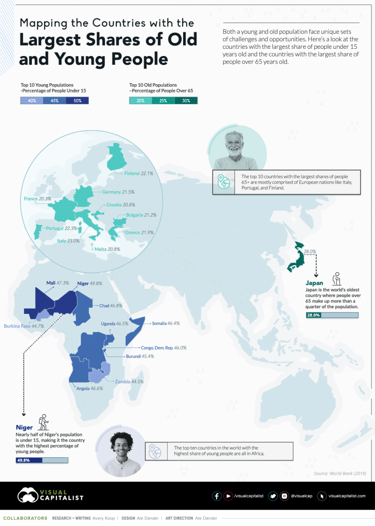 This visualization uses data from the World Bank to examine the countries with the highest shares of old and young people.